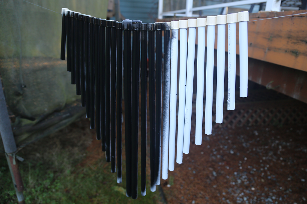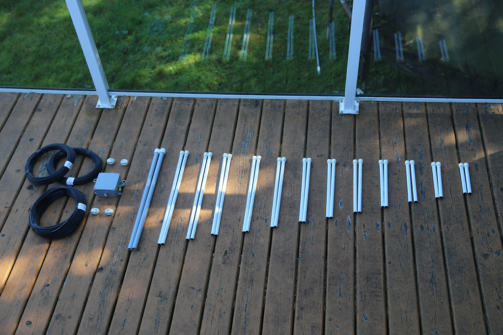 Spacers have been cut from the plastic pipes, with caps on top (not on the bottom). The first two spacers are stronger than others, because they have to route all wires to the balun. Flex-Weave #12 AWG wire is used for all bands, although for future builds only 80 m wire can be #12 AWG, others can be thinner, at least #14 AWG or less. 80 m wire carries all the load. Especially in my case, when it was no central support initially, so all wires of all bands were hanging on 80 m wire. It was actually U-shaped dipole, "Non-Inverted U".